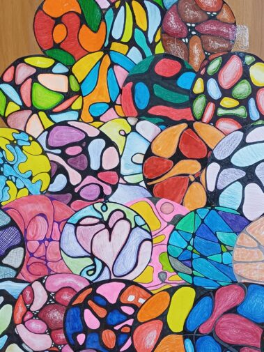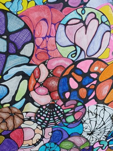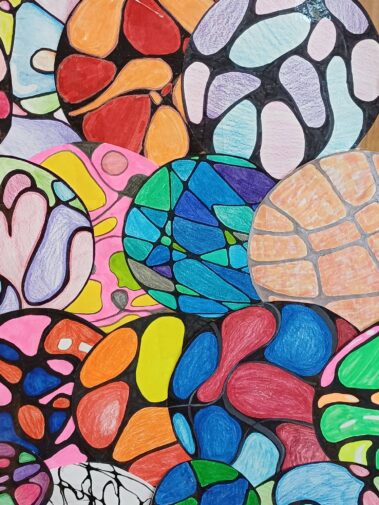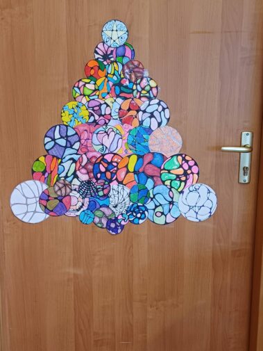 W sali nr 22 naszego liceum świątecznie! Choinka wykonana z neurograficznych bombek przygotowanych przez uczniów klasy 3f na zajęciach- Elementy matematyki- neurografika.
